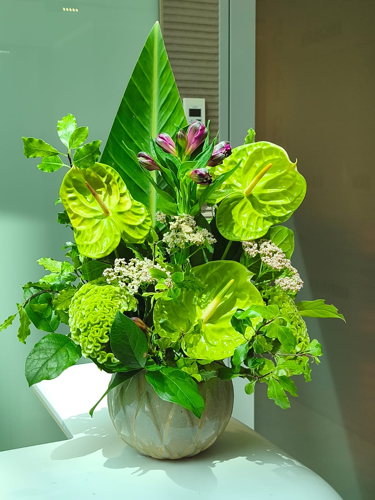 Un aranjament floral modern, dominat de nuante vibrante de verde, creat pentru spatii corporate contemporane. Compozitia imbina anthurium verde cu flori si texturi naturale, rezultand un decor proaspat si energizant.