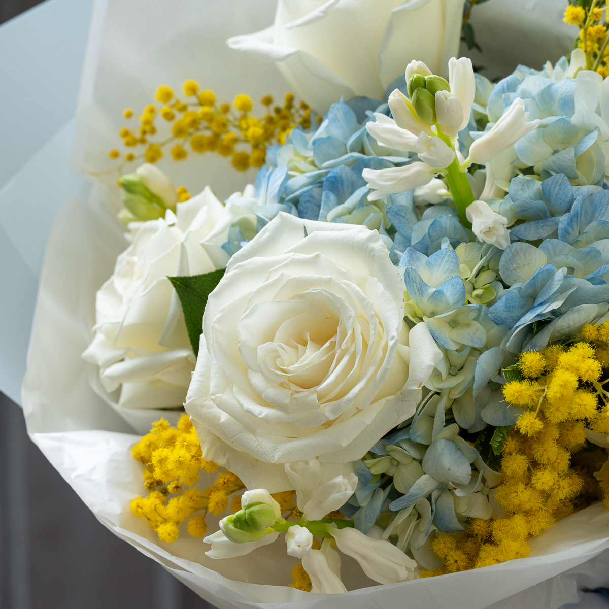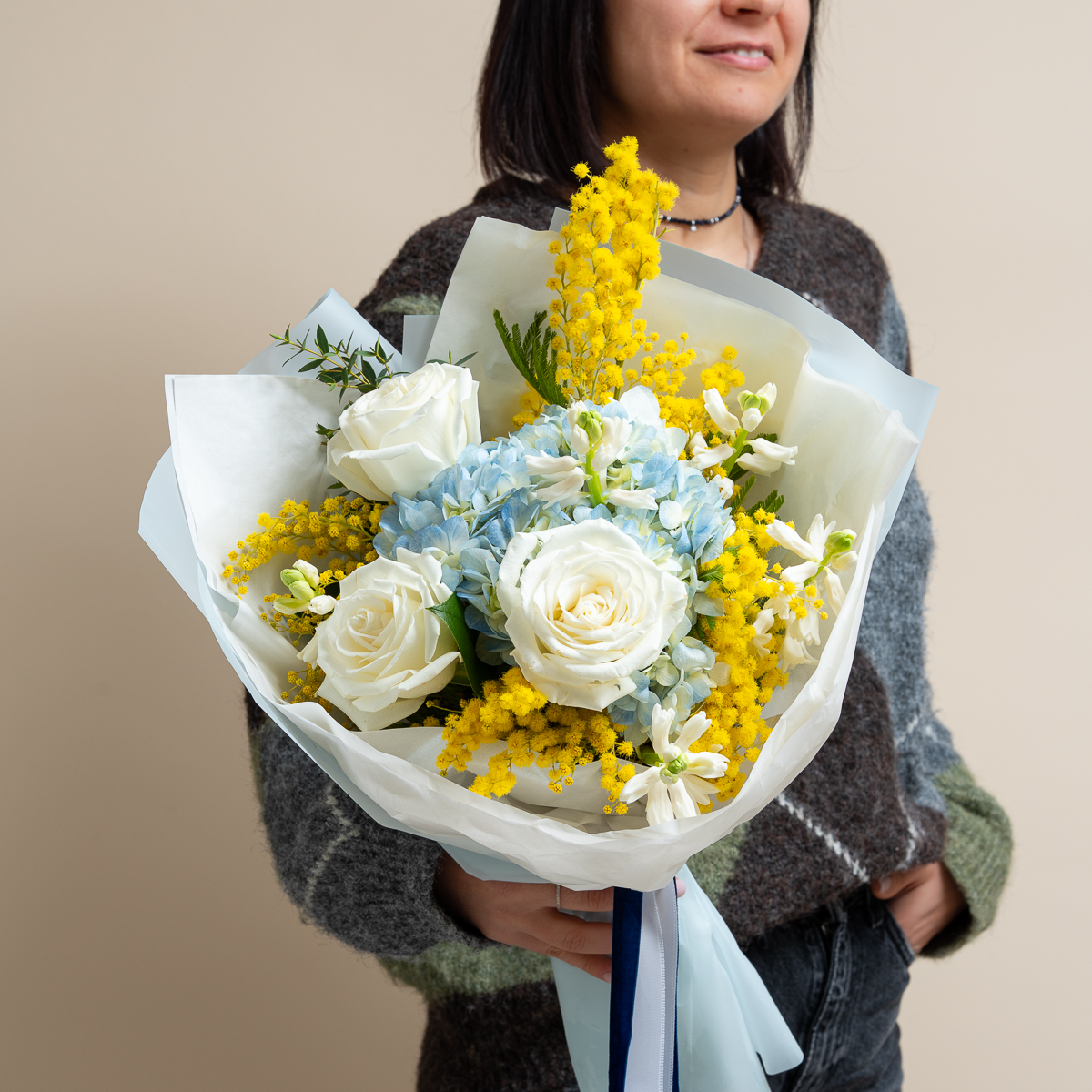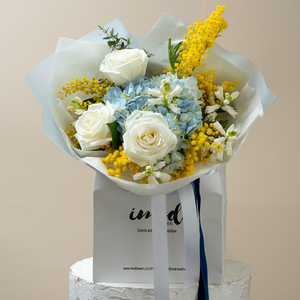 Contrastul dintre albul curat al trandafirilor, galbenul intens al mimosei si tonurile delicate de albastru creeaza un buchet echilibrat, cu un aer solar si natural. Compozitia este gandita astfel incat fiecare floare sa respire, pastrand un aspect aerat si elegant.