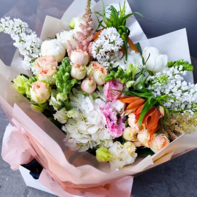 Buchet de flori pastel, voluminos, cu trandafiri roz, bujori si flori albe, livrat in Sector 1